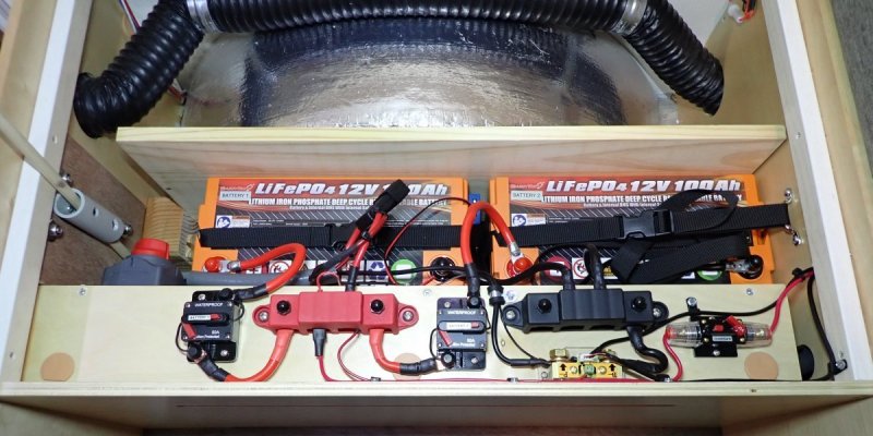 - Two 100ah Lithium batteries (inside), Victron Smart Charger and Renogy Battery Shunt and Monitor